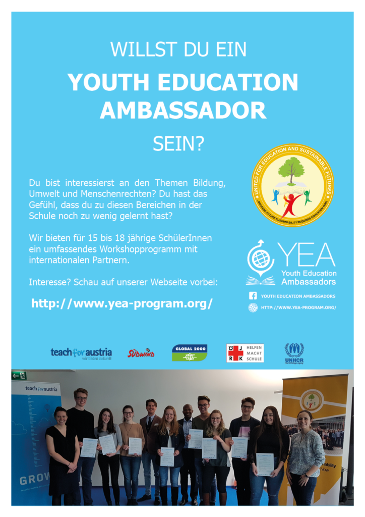 Wir freuen uns euch mitteilen zu können, dass wir auch für kommendes Schuljahr wieder auf der Suche nach motivierten Jugendlichen sind, die beim YEA-Program teilnehmen wollen.